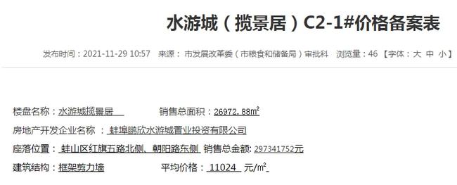 11月29日蚌埠市发改委公示了水游城(揽景居)C2-1#共计272套房源的房价备案。