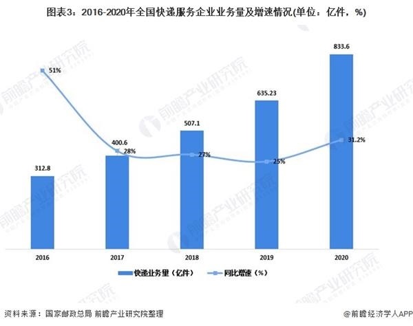 近年来,随着市场需要的快速提升以及快递行业的高速发展,我国邮政业务结构变化明显,邮政寄递服务业务规模增长缓慢,而快递业务规模高速发展。2020年,全国快递服务企业业务量累计完成833.6亿件,同比增长31.2%。