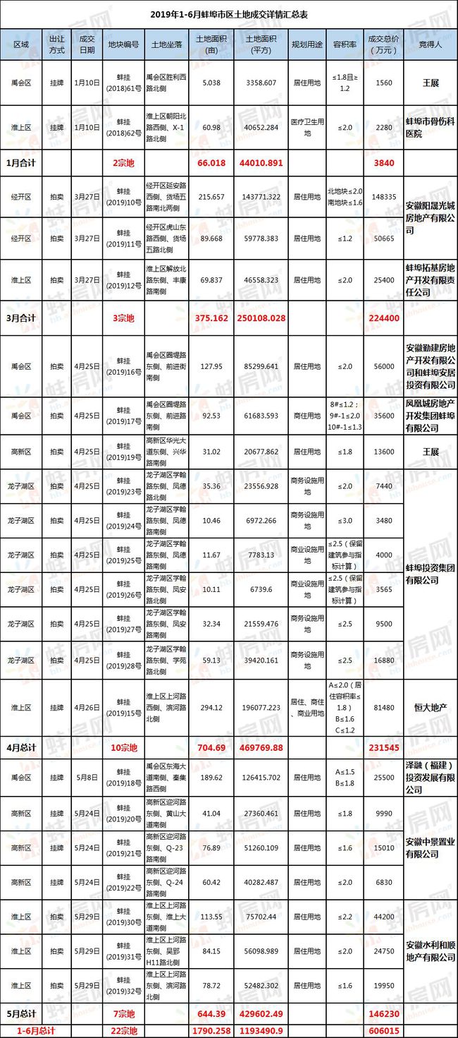 月度变化方面,2月、6月蚌埠无商住用地成交;土地成交量最大的两个月依次是4月(10幅共计704.69亩)、5月(7幅共计644.39亩)。