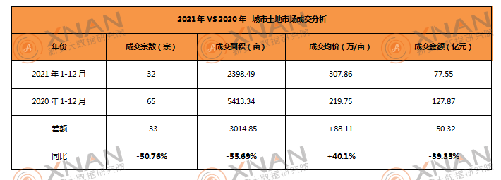 据新安大数据研究院统计,2021年1-12月,城市(含县城)成交32宗商住地块,成交面积约2398.49亩(159.9万㎡),成交均价为307.86万元/亩,总揽金为77.55亿元,,同比:成交面积下跌55.69%,成交均价上涨40.1%,成交金额下跌39.35%。