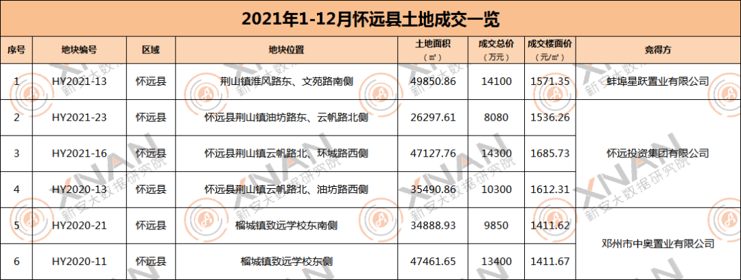 2021年1-12月,怀远县成交6宗商住用地,总面积约361.68亩(约24.11万方),成交总价70030万元,平均成交地价194.27万元/亩,其中,成交楼面价最高的是HY2021-16地块,楼面价为1685.73元/㎡。