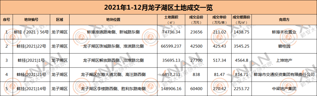 2021年1-12月,龙子湖区成交5宗地块,总面积约499.19亩(约33.28万方),成交总价155094万元,平均成交地价301.14万元/亩。其中,成交楼面价最高的蚌挂(2021)1号地块,楼面价为4564.8元/㎡。