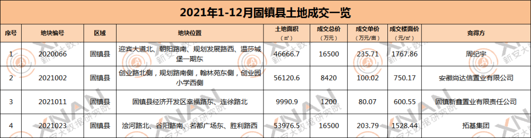 2021年1-12月,固镇县成交4宗居住用地,总面积约250.13亩(约16.68万方),成交总价42620万元,平均成交地价154.9万元/亩,其中,成交楼面价最高的2020066地块,楼面价为1767.86元/㎡。