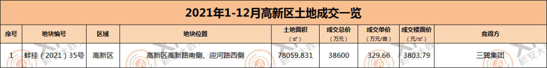 2021年1-12月,高新区成交1宗商住用地,总面积约117.09亩(约7.81万方),成交总价38600万元,平均成交地价329.66万元/亩,成交楼面价为3803.79元/㎡。