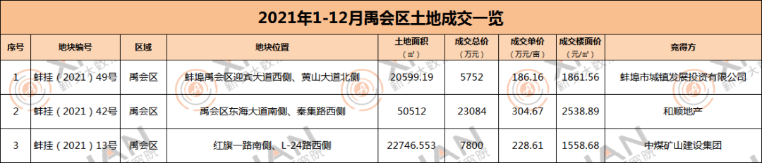 2021年1-12月,禹会区成交3宗居住用地,总面积约140.79亩(约9.39万方),成交总价36636万元,平均成交地价239.81万元/亩。其中,成交楼面价最高的蚌挂(2021)42号地块,楼面价为2538.89元/㎡。