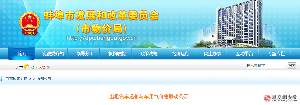 凤凰网安徽从蚌埠市发改委了解到,11月6日,蚌埠市价格管理科发布了《出租汽车运价与车用气价格联动公示》,公示标明,根据国家发改委有关政策规定,2018年11月起,非居民用天然气价格实行季节性上浮,蚌埠