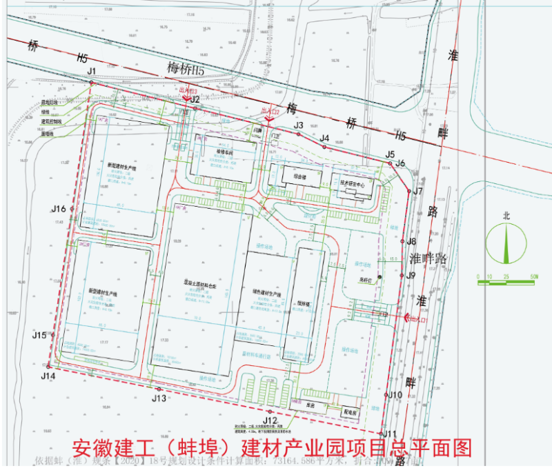 安徽建工集团蚌埠建材有限公司拟在淮畔路西侧、梅桥H5路南侧建设安徽建工(蚌埠)建材产业园项目。按照住房和城乡建设部《关于城乡规划公开公示的规定》的通知要求,现公示该项目规划总平面图。