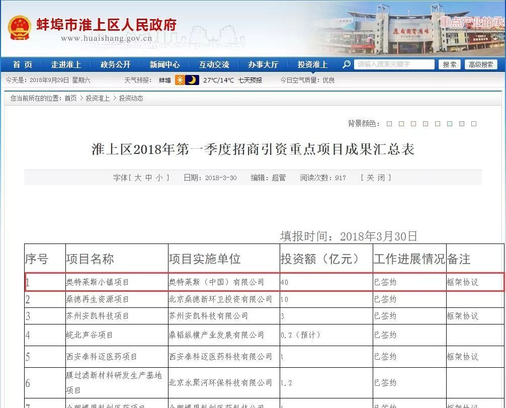 据淮上区2018年一季度招商引资成果汇总表显示,奥特莱斯小镇项目投资额约40亿元。