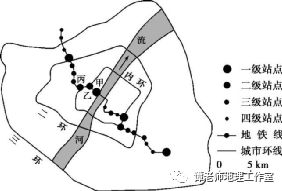 某条城市地铁线穿越大河,途经主要的客流集散地。下图示意该地铁线各站点综合服务等级。据此完成下面两题。