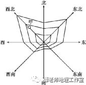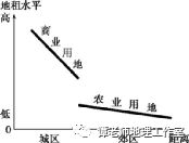 地租是城市各种环境因素在经济上的综合表现。下图显示了某市中心城区地租从中心向边缘递减的变化趋势。由于环境质量、基础设施等因素的不同,城市不同方向的地租变化程度存在差异。