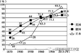 日本统计年份数据表明,沿海地区的人口密度非常高,1/3的人口居住在东京周围的中央平原。在东京,每个工作日有500多万人上下班,人均通勤时间为3个小时。统计数据表明,在8 000万德国人口中,居住在10万以上较大城市的人口仅有2 500万,占总人口的30%左右,而有70%的人口居住在10万人口以下的较小城市中。下图为美、日、德三国城市化发展历程(%)图。据此完成下面三题。
