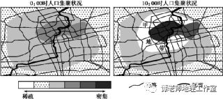 下图反映我国某城市某工作日0:00时和10:00时的人口集聚状况,该图由手机定位功能获取的人口移动数据制作而成。读图回答下面两题。