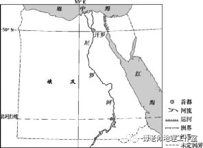 埃及沙漠广布,人口、城市主要集中在尼罗河谷地和三角洲,首都开罗人口约1 800万,是埃及政治、经济、文化中心。2015年3月,埃及宣布在开罗以东的沙漠地区兴建新首都。新首都作为政治中心,规划容纳500万居民,提供175万个长期工作职位。下图为埃及略图。据此完成下面三题。