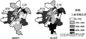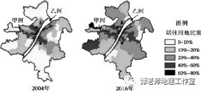 读W市主城区2004年与2016年工业和居住用地情况图(下图),回答下面两题。